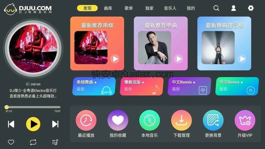 音乐风格全面覆盖: 中文DJ舞曲、英文DJ舞曲 DJ串烧、酒吧慢摇、DJ慢歌连版 DJ Remix、Mashup、Electro、House Funky、Reggaeton、HipHop、R&B、Pop 以及更多时尚节奏与潮流混合曲风……