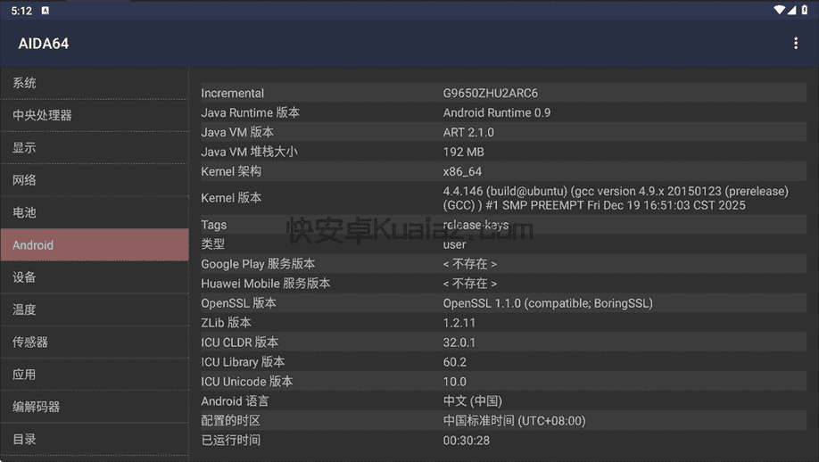 AIDA64 for Android,最权威安卓设备硬件检测利器。它是其它硬件性能检测App难以与之相比的,无论是设备型号、系统版本信息,还是CPU、显示屏和GPU的详细信息,连CPU缓存、GPU ALU、传感器工作状态、网络信息和电池信息、Java虚拟机配置乃至系统System目录各关键文件的详细内容,都能专业读取。